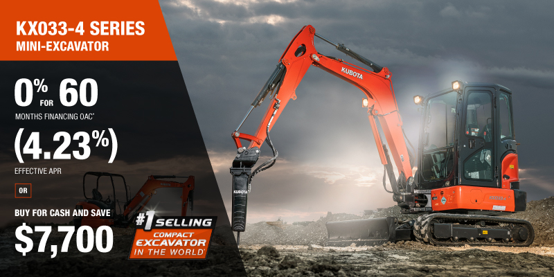 Representative finance example for the KX033-4: $85,552.41 financed at 0% (4.23% effective APR which factors in $7,700.00 in non stackable cash that cannot be combined with finance offers) equals $1282.67 monthly for 60 months. $8,551.11 down payment required. Cost of borrowing is $7,700.00 for a total obligation of $85,552.41. Financing available on approved credit. Prices and payments include freight and other applicable fees (including environmental fees, administration fees, set-up fees, and dealer fees on the model specified). Excavator Claim: "Kubota is the world’s #1 selling compact excavator for 20 years." Disclaimer: According to 2023 data from Off-Highway Research including all Kubota Group brand sales. Offer valid until 06-30-2026.