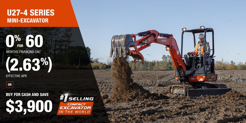 Representative finance example for the U27-4: $67,828.75 financed at 0% (2.63% effective APR which factors in $3,900.00 in non stackable cash that cannot be combined with finance offers) equals $1017.92 monthly for 60 months. $6,786.13 down payment required. Cost of borrowing is $3,900.00 for a total obligation of $67,828.75. Financing available on approved credit. Prices and payments include freight and other applicable fees (including environmental fees, administration fees, set-up fees, and dealer fees on the model specified). Excavator Claim: "Kubota is the world’s #1 selling compact excavator for 20 years." Disclaimer: According to 2023 data from Off-Highway Research including all Kubota Group brand sales. Offer valid until 06-30-2026.